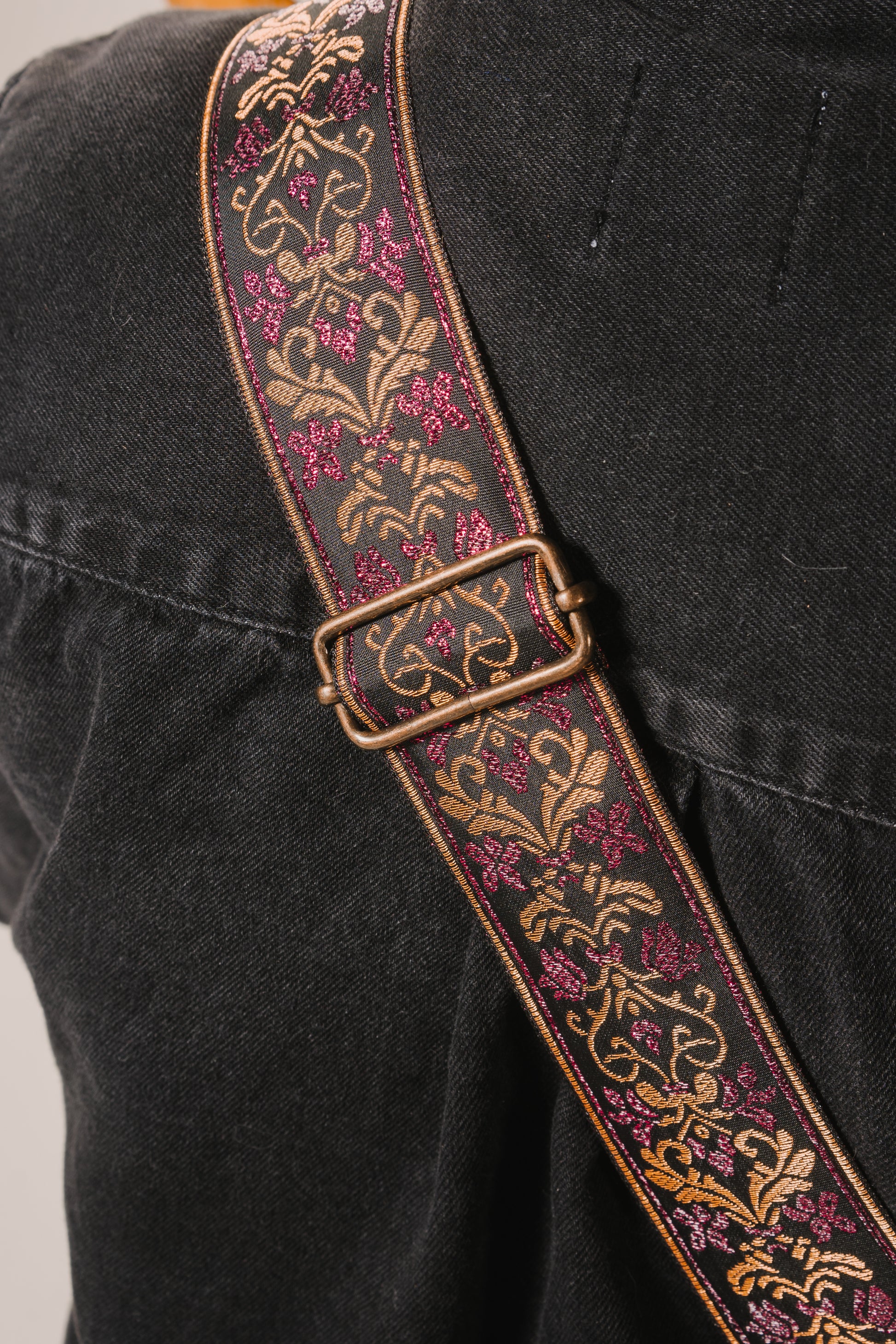 Esta pieza es bordada en hilos metálicos, es cosida y ensamblada en nuestro taller con herrajes estilo vintage, cinta de suave nylon y el mejor cuero.
